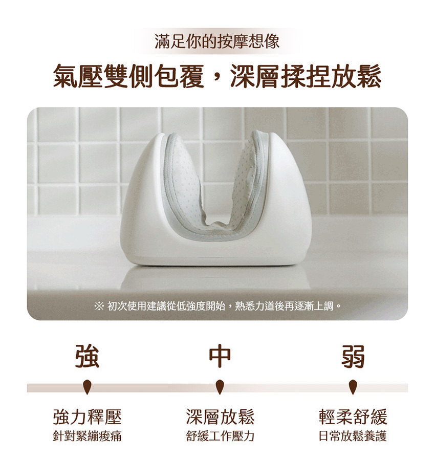 ❶ 氣壓雙側包覆夾揉,仿人手按摩體驗