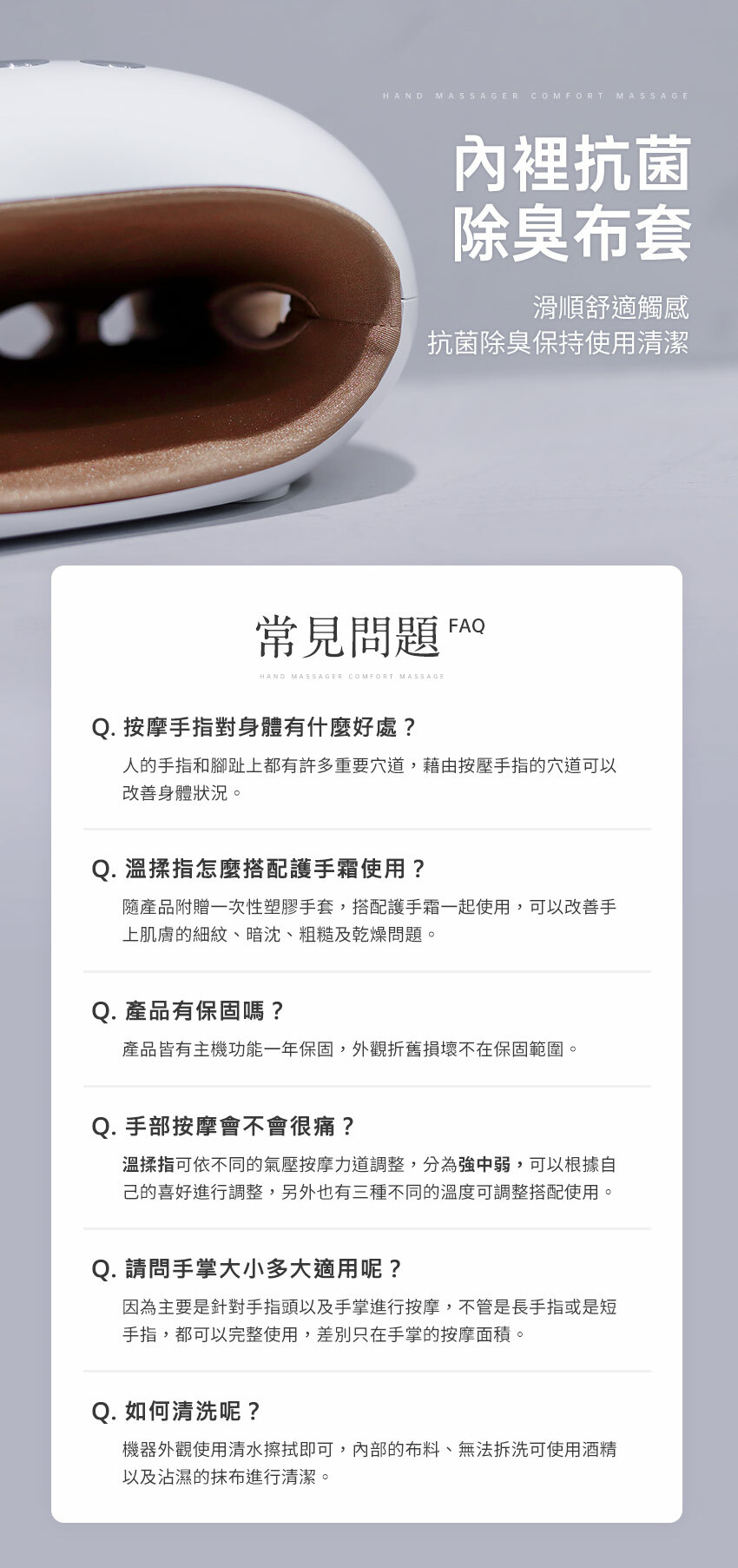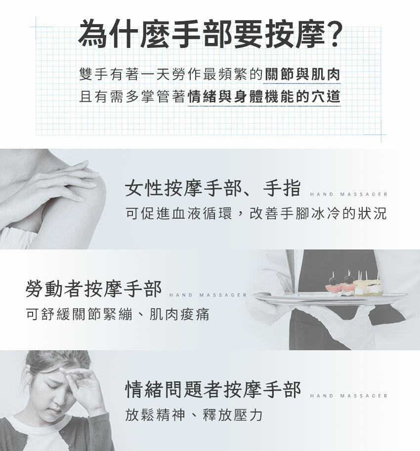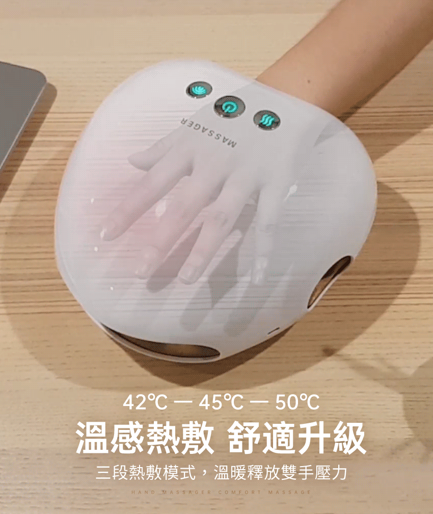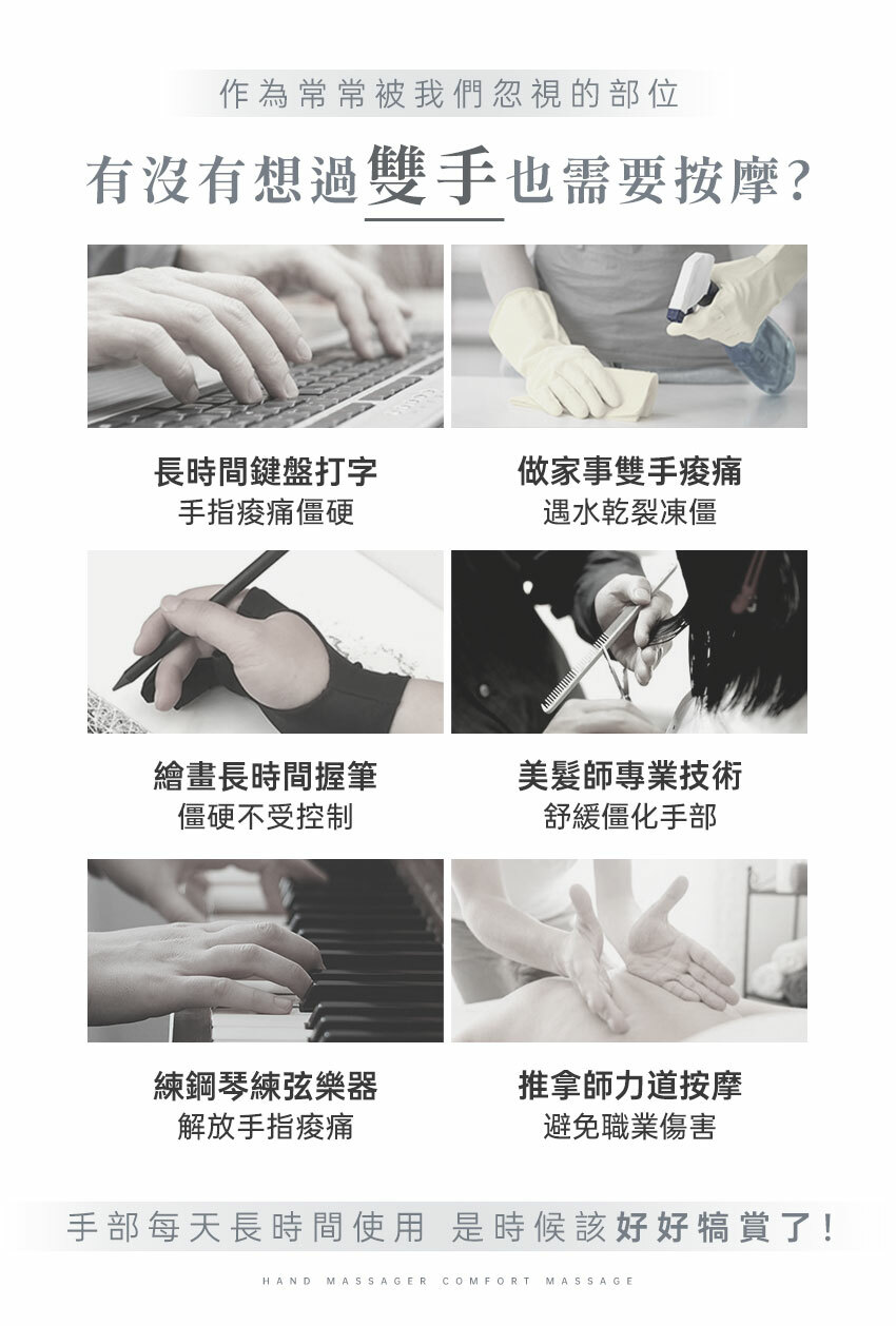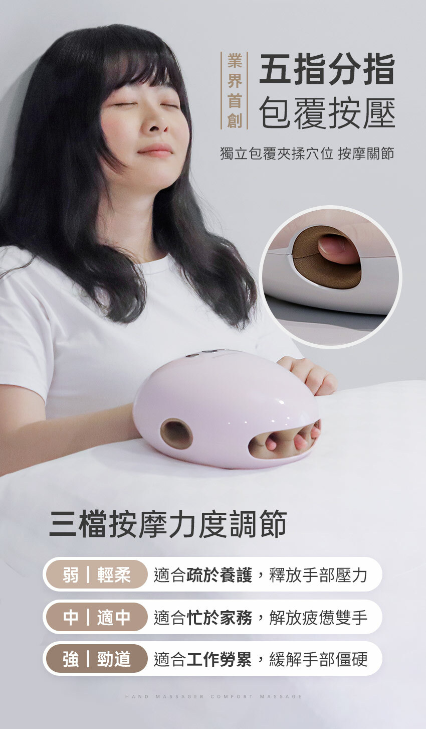 ❶ 五指獨立包覆,夾揉穴位按摩關節